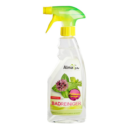 AlmaWin Badreiniger mit Schaumsprayer-Aufsatz, denn der Schaum haftet länger auf der zu reinigenden Fläche, kann also besser einwirken und es entsteht fast kein Sprühnebel mehr. So können auch empfindliche Nasen aufatmen.
