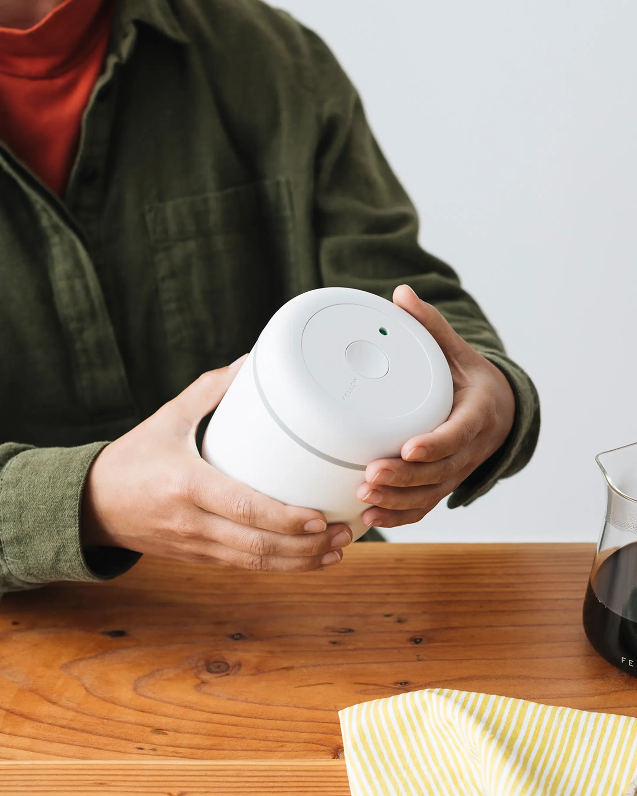 Der luftdichte Kaffeebehälter von Fellow (Atmos in Matte White, 1.2L) verfügt über einen einfachen Drehmechanismus um Sauerstoff aus dem Gehäuse zu bekommen. So verhinderst du weitere Oxidationen. Dabei ist es einfach zu verschließen, aber genauso auch es wieder zu öffnen. Denn wenn das Verlangen nach Kaffee wieder groß wird, brauchst du nur den Knopf am Deckel zu betätigen um den Luftdruck wieder herzustellen.