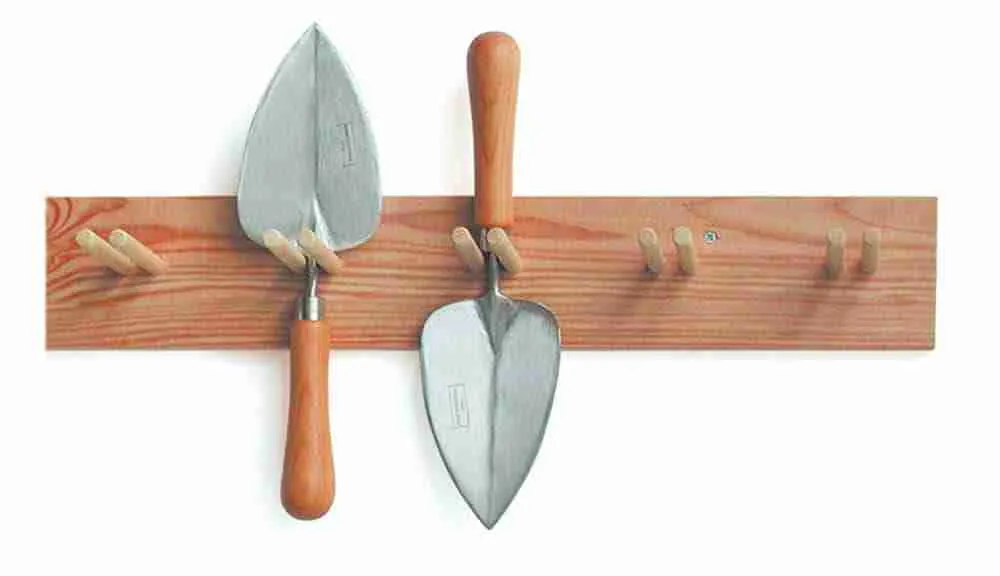 Gut aufgehobene Gartengeräte und Zubehör hängen an dieser Werkzeug-Garderobe aus Holz stets griffbereit an der Wand. 60cm breit.