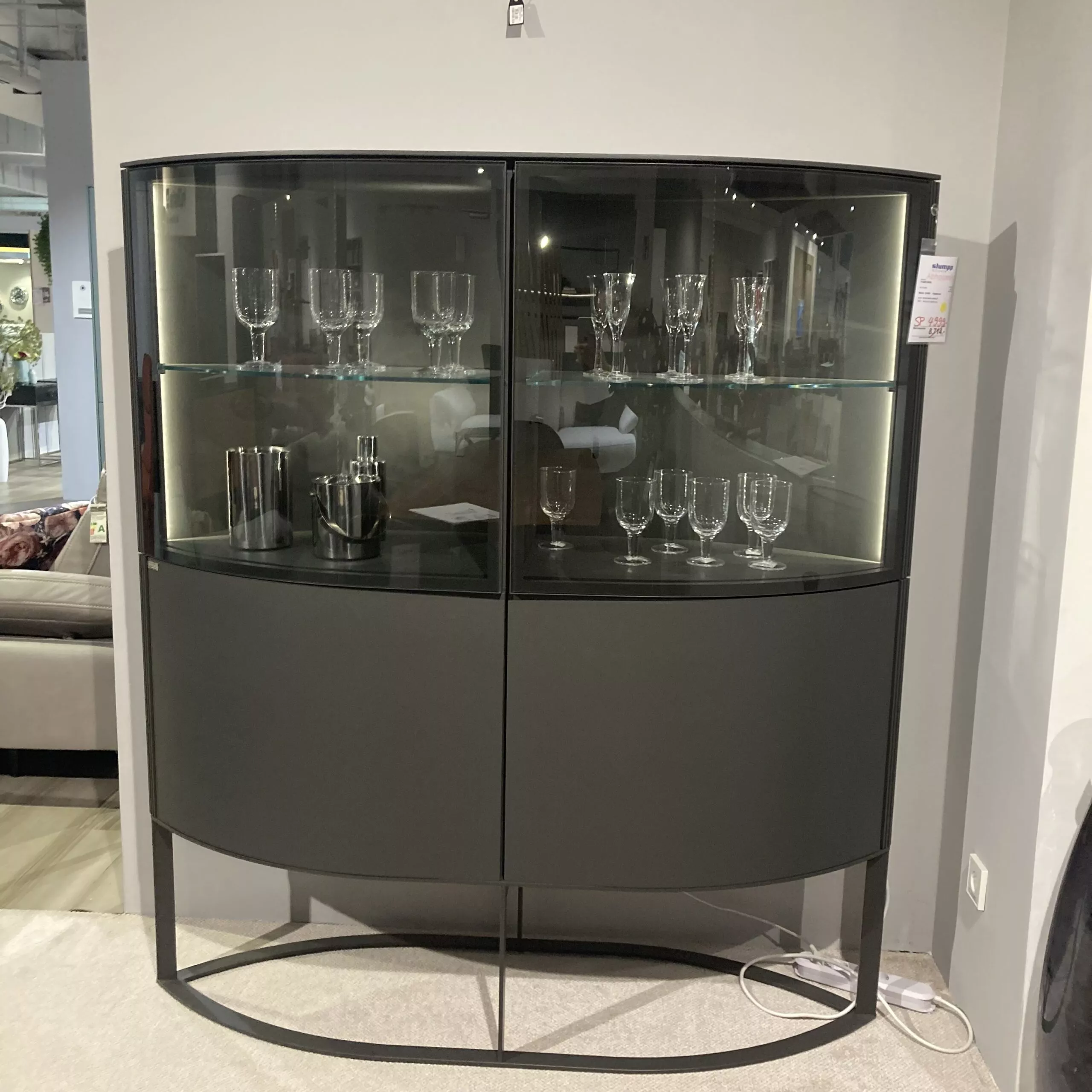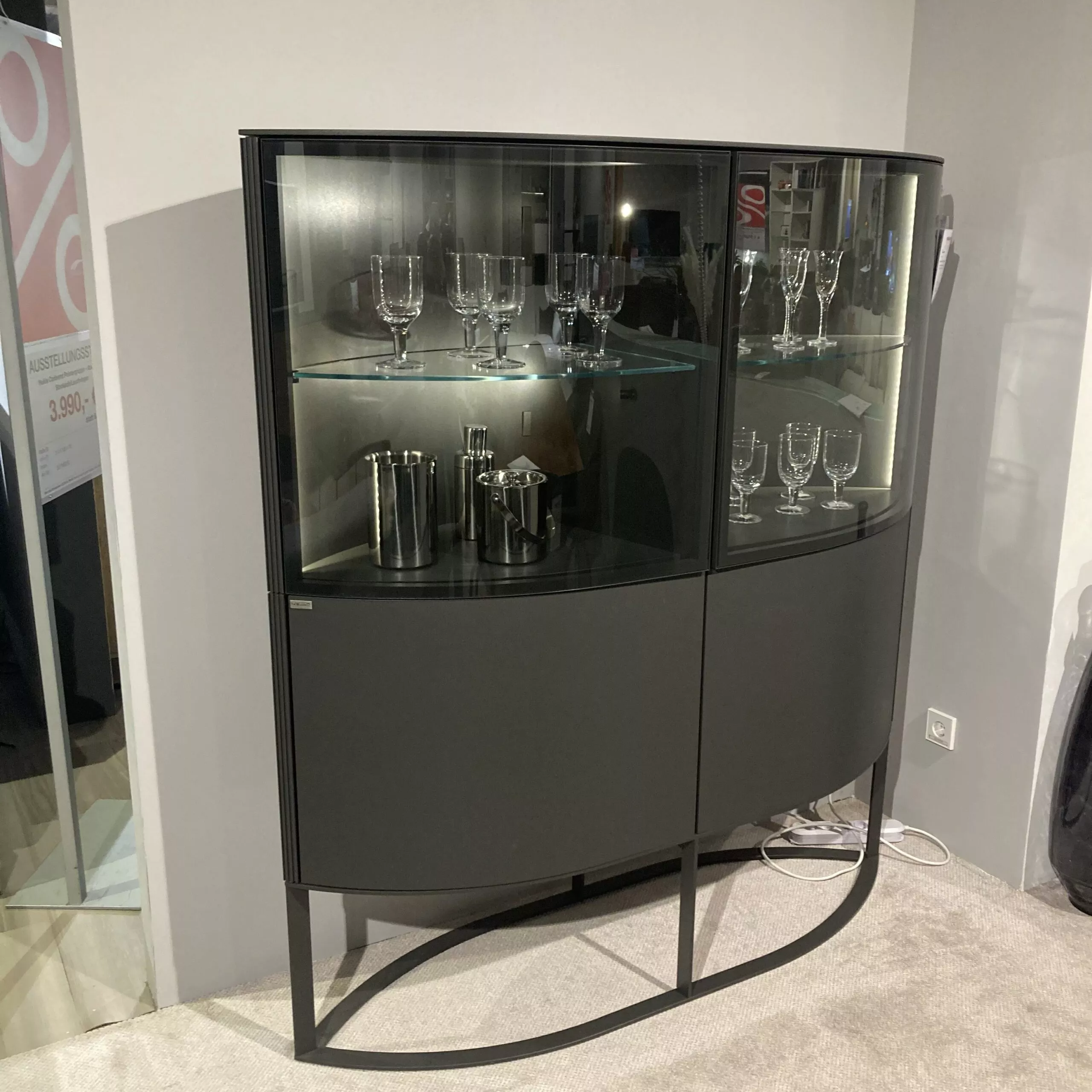 Das Highboard Navis 91403 von Hülsta besticht durch sein modernes Design und praktische Funktionalität. Die Ausführung in Strukturlack anthrazit harmoniert perfekt mit den 2 Glastüren und 2 Türen. Mit Metallgestell in anthrazit und schwarzen Metallkufen verleiht es jedem Raum eine zeitgemäße Eleganz. Inklusive LED-Beleuchtung mit Funkfernbedienung. Das Highboard kann gerne vor Ort in unserer Ausstellung in Stockach besichtigt werden.