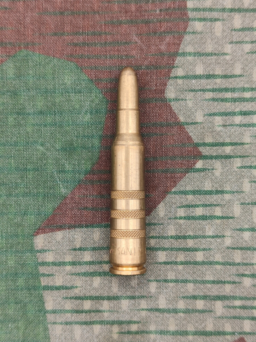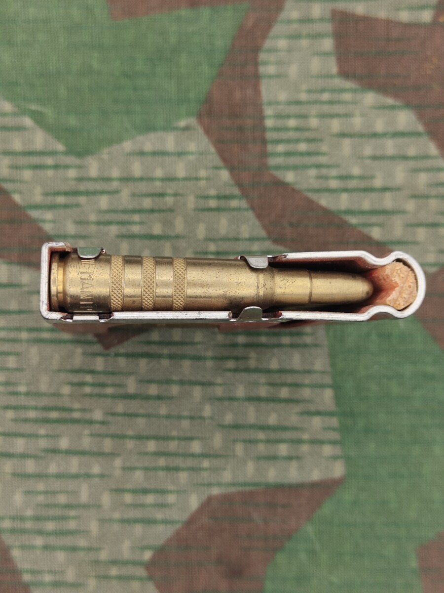 Diese Lader wurden für das Exerzieren von Manipulationen am Sturmgewehr 57 verwendet. Die Manipulierpatrone mit Gravur sind sehr selten zu finden.