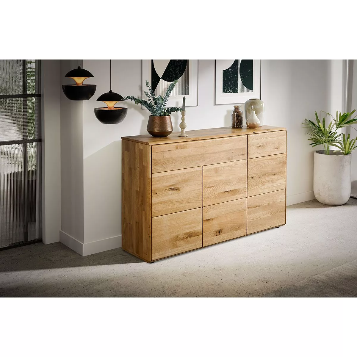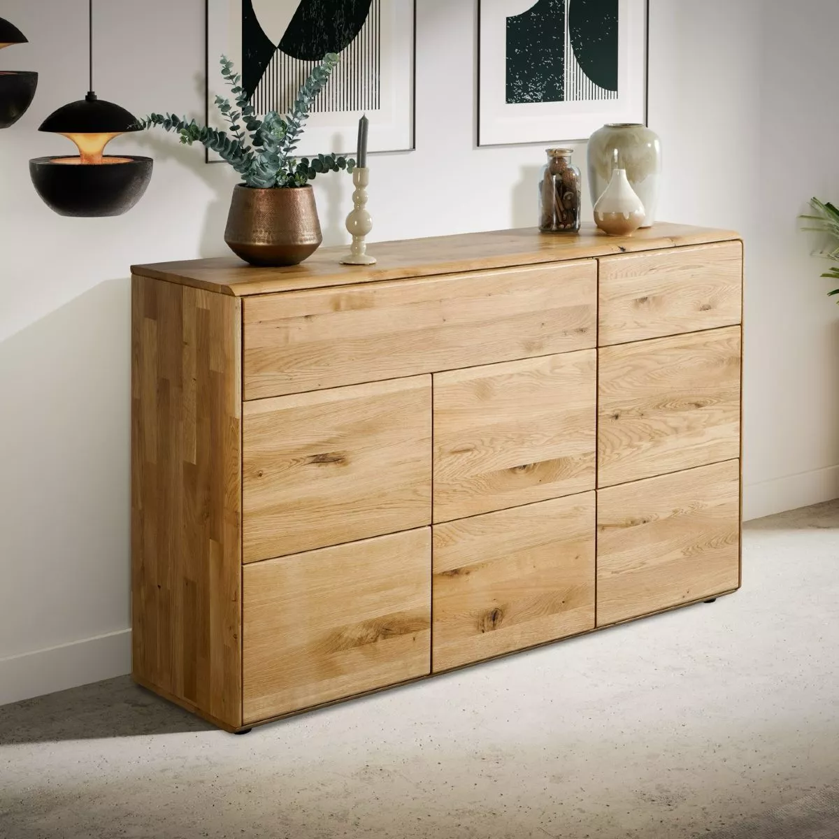 Durch die puristische Form der Kommode kommt das Holz besonders gut zur Geltung. Die grifflosen Fronten fügen sich perfekt in das Gesamtbild ein und lassen sich dank einer praktischen Tip-on-Funktion mit leichtem Druck öffnen und schließen.
