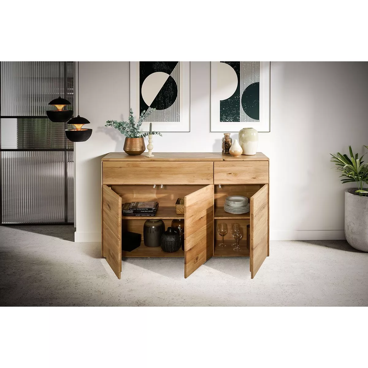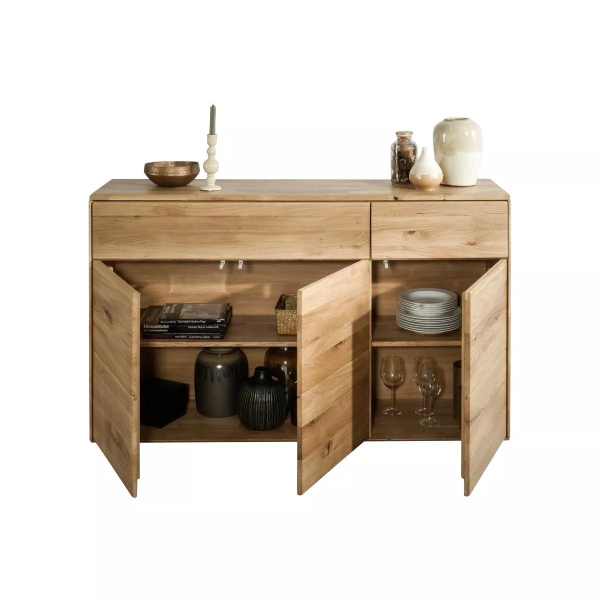 Die Genf Kommode ist mit ihrem zeitlosen Design ein Allrounder und bietet viel flexibel einsetzbaren Stauraum. Hinter den zwei Türen auf der linken Seite befinden sich zwei großzügige Fächer, die durch einen Einlegeboden getrennt sind. Hinter der rechten Tür befindet sich ein Abteil, das ebenfalls durch einen Fachboden enthält. Hier finden beispielsweise Geschirr oder Tischwäsche üppigen Platz. In den zwei Schubkästen darüber lassen sich Besteck oder Schreibutensilien ordentlich verstauen.