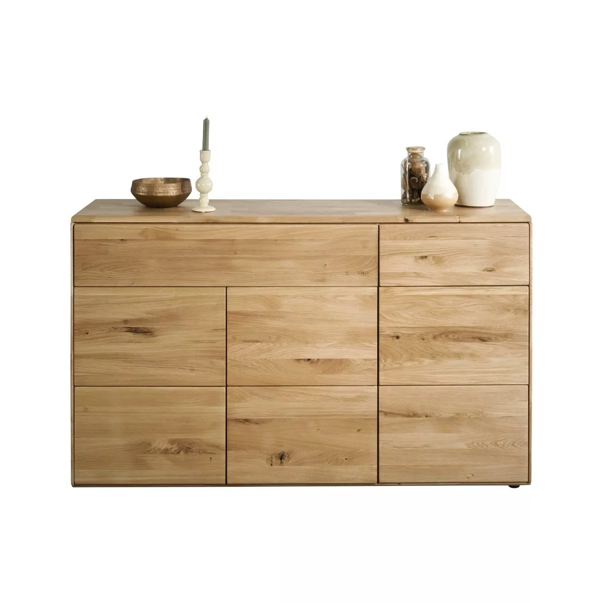 Bei Genf ist jedes Stück ein Unikat, da diese Kommode aus Massivholz gefertigt ist. Verschiedene Farbgebungen und Maserungen unterstreichen die Einzigartigkeit. Sie haben hier die Wahl zwischen den Varianten Wildeiche oder massive Kernbuche. Die Ausführung in Wildeiche zeichnet sich durch eine stärkere Maserung mit natürlichen Astverläufen aus, wohingegen das Kernbuchenholz feinere Farbspiele aufweist.