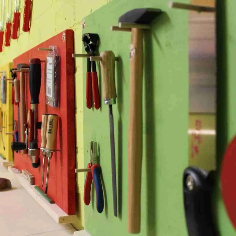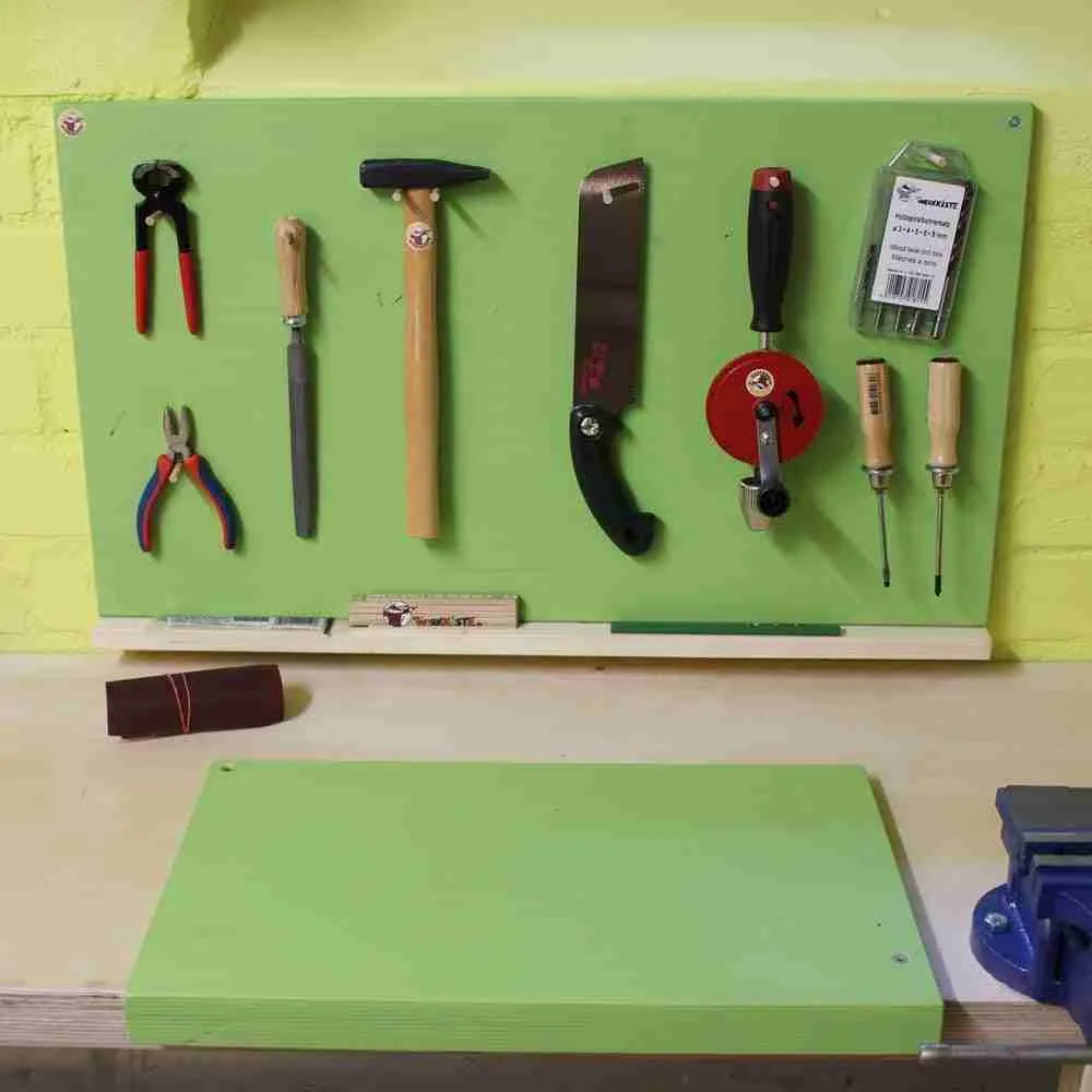 Eine praktische und übersichtliche Werkzeugaufbewarung, so sind die wichtigsten Werkzeuge schnell zur Hand. Durch die verschiedenen Farben finden Kinder schnell Ihren Arbeitsplatz wieder. Durch die Aufhängungen die zu den Werkzeugen passen lernen die Kinder auf diese Weise schnell, dass Werkzeug sich durch die sichere Verwahrung und einen eigenen Platz vom Spielzeug unterscheidet. Die passende Tischschutzunterlage bietet genugend Platz zum Werken.