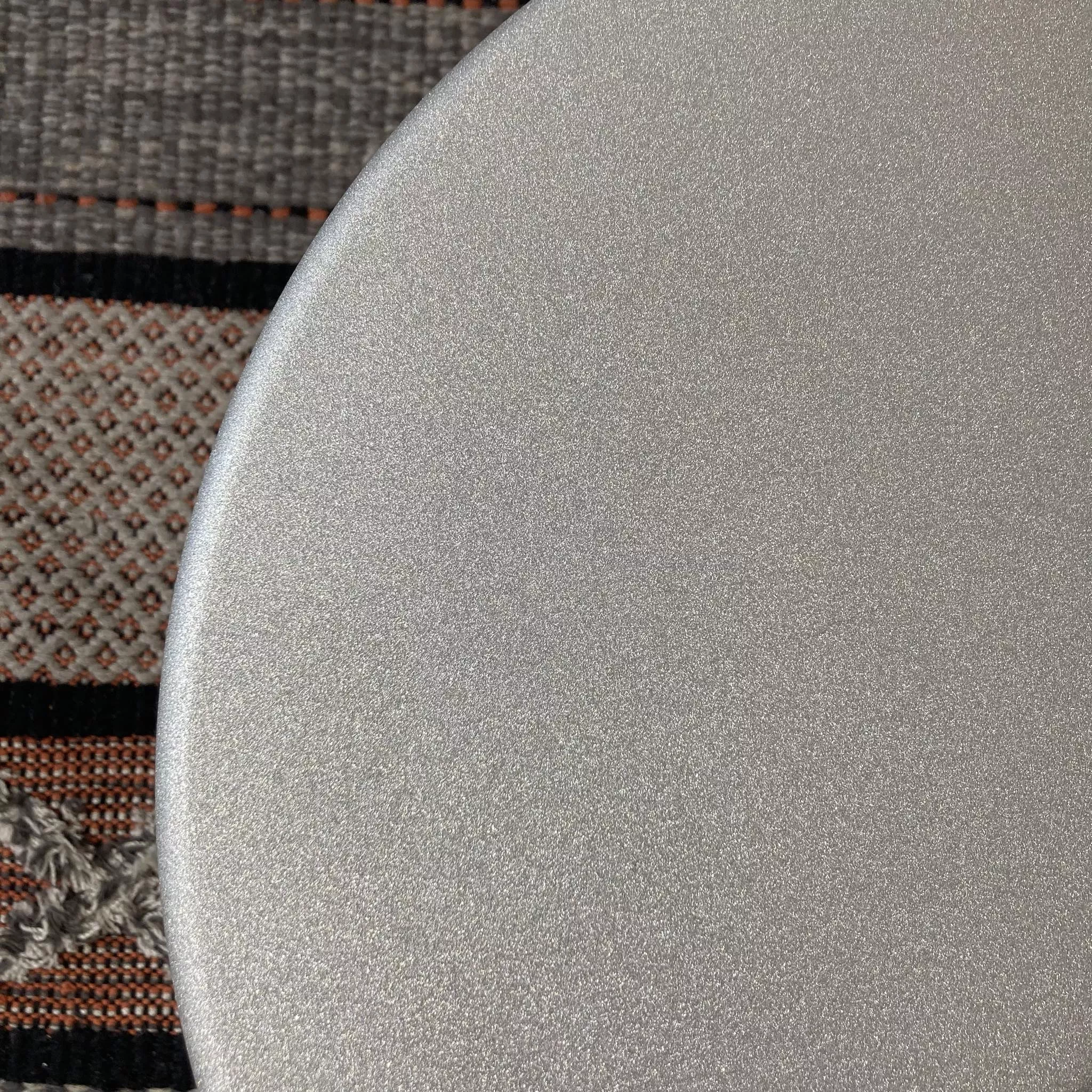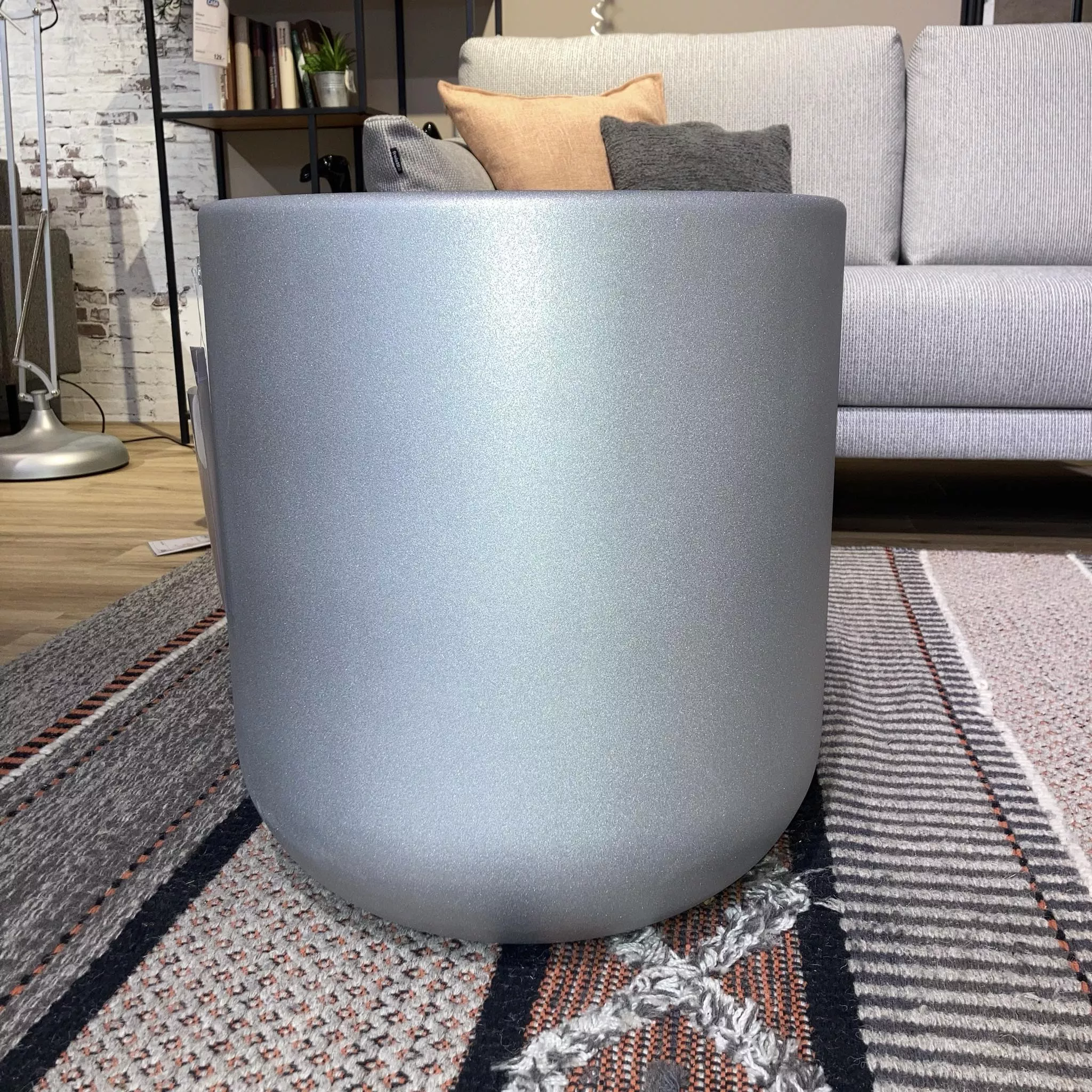 Moderner zylinderförmiger Couchtisch aus weiß Aluminium mit glitzernden Oberfläche.