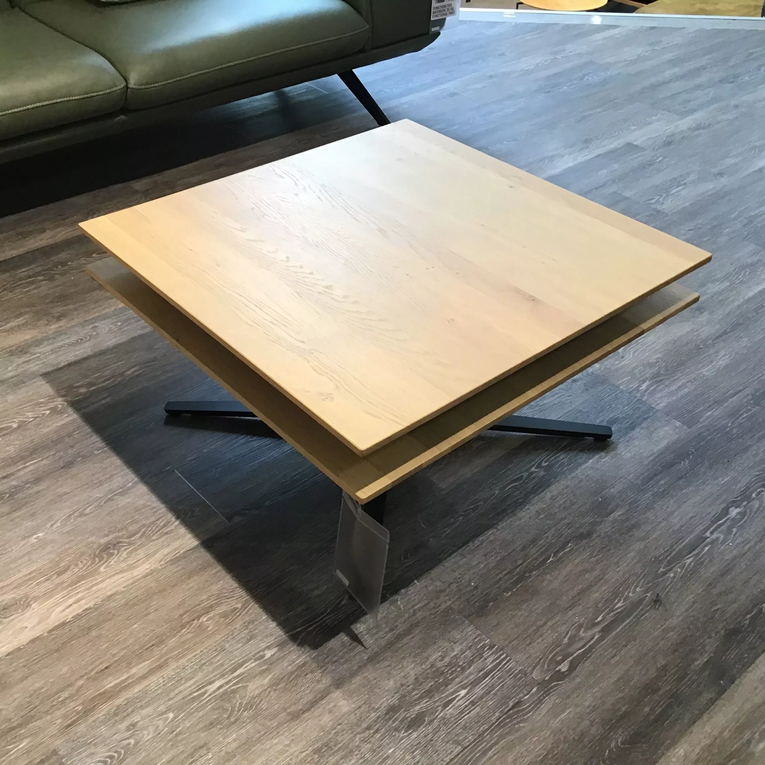 Schöner Couchtisch von Ronald Schmitt mit drehbarer Tischplatte und Ablage aus Wildeiche bianco, Gestell in Tiefschwarz.