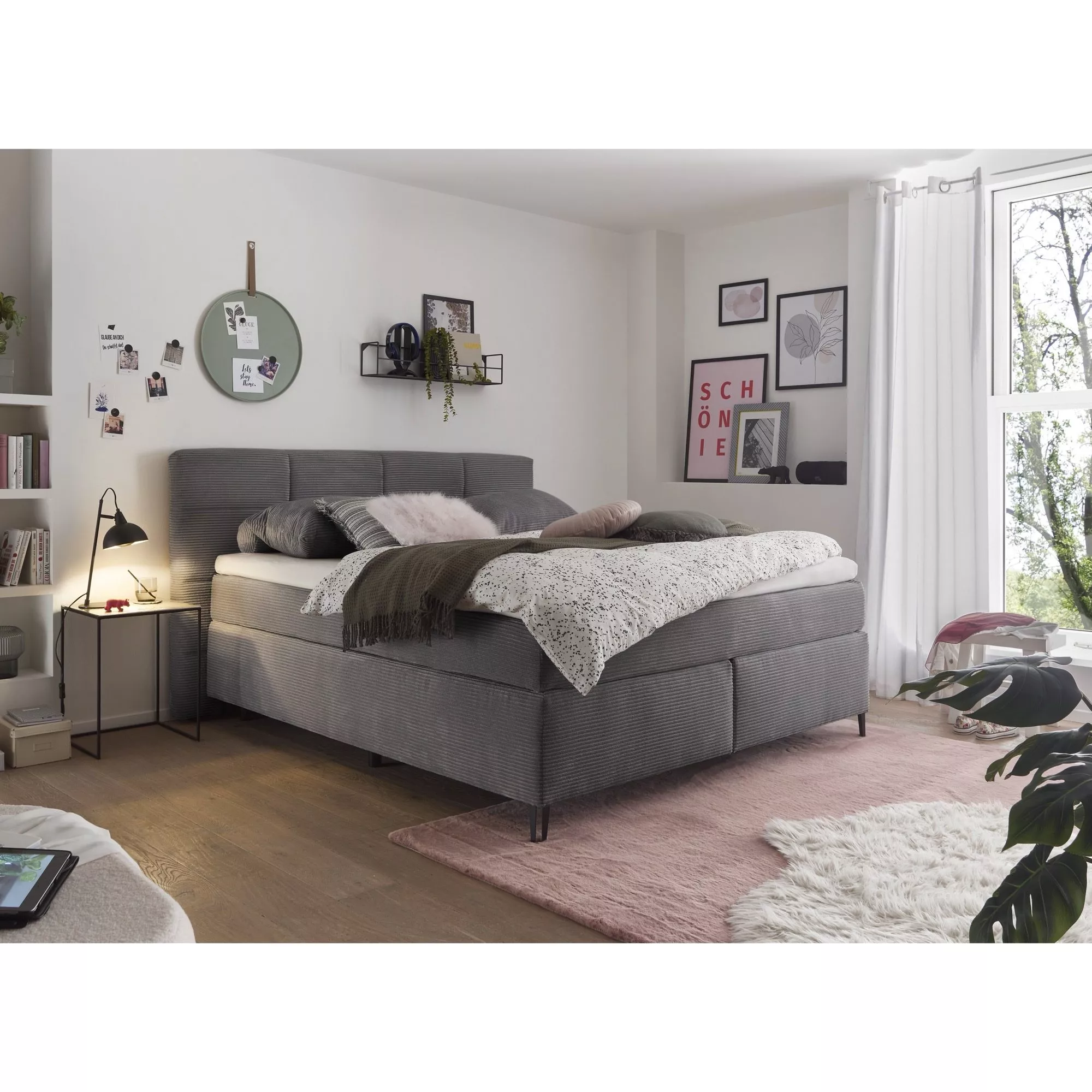 Holen Sie sich mit dem Fairfield Boxspringbett der Marke set one by Musterring hochwertigen Schlafkomfort und einen angesagten Look in Ihr Schlafzimmer. Entspannen Sie auf der Wendematratze mit Härtegrad H3/H4 und wählen Sie den Bezug aus Ribcord in Ihrer Lieblingsfarbe. Als Zusatz können Sie ein farblich passendes Kissenset dazu auswählen.