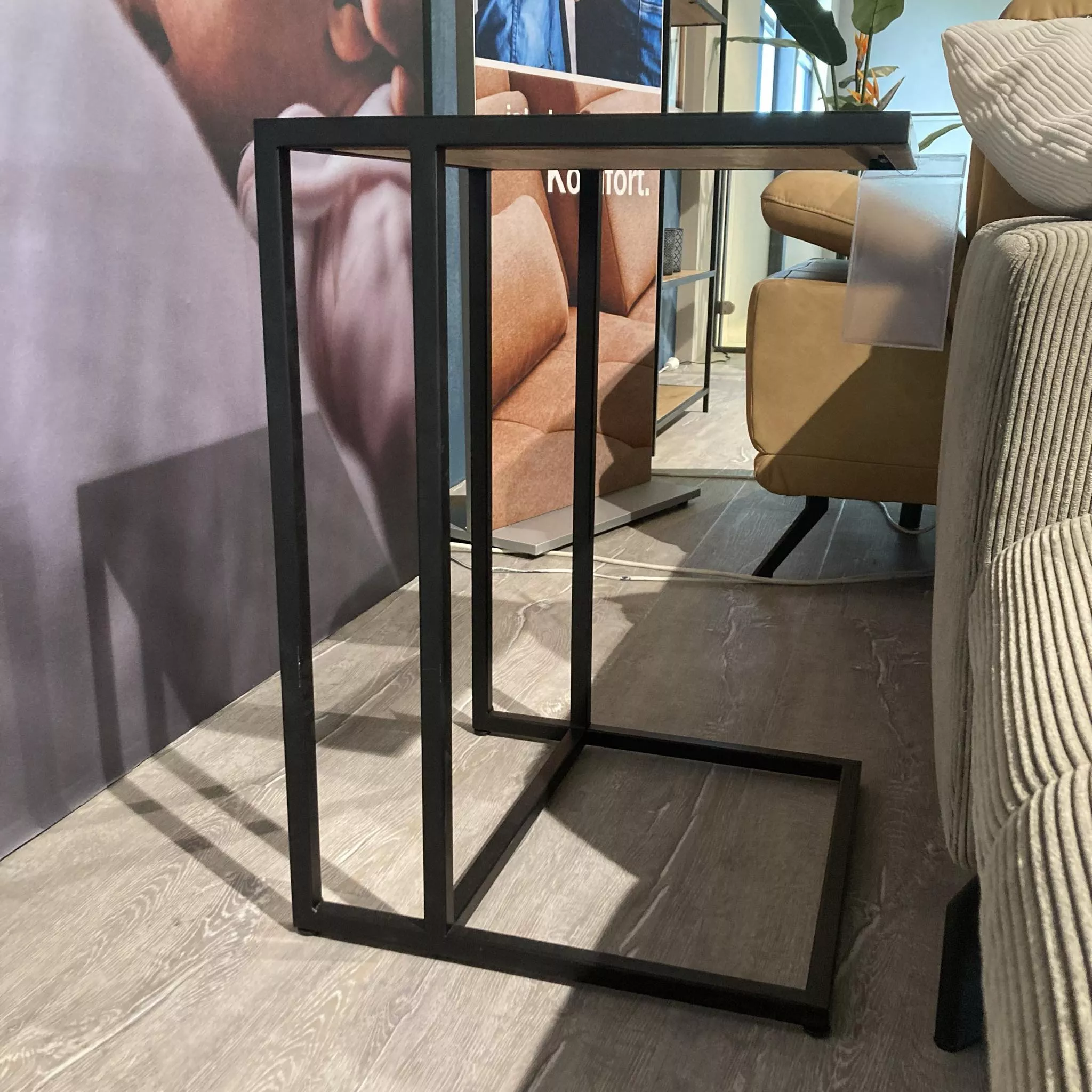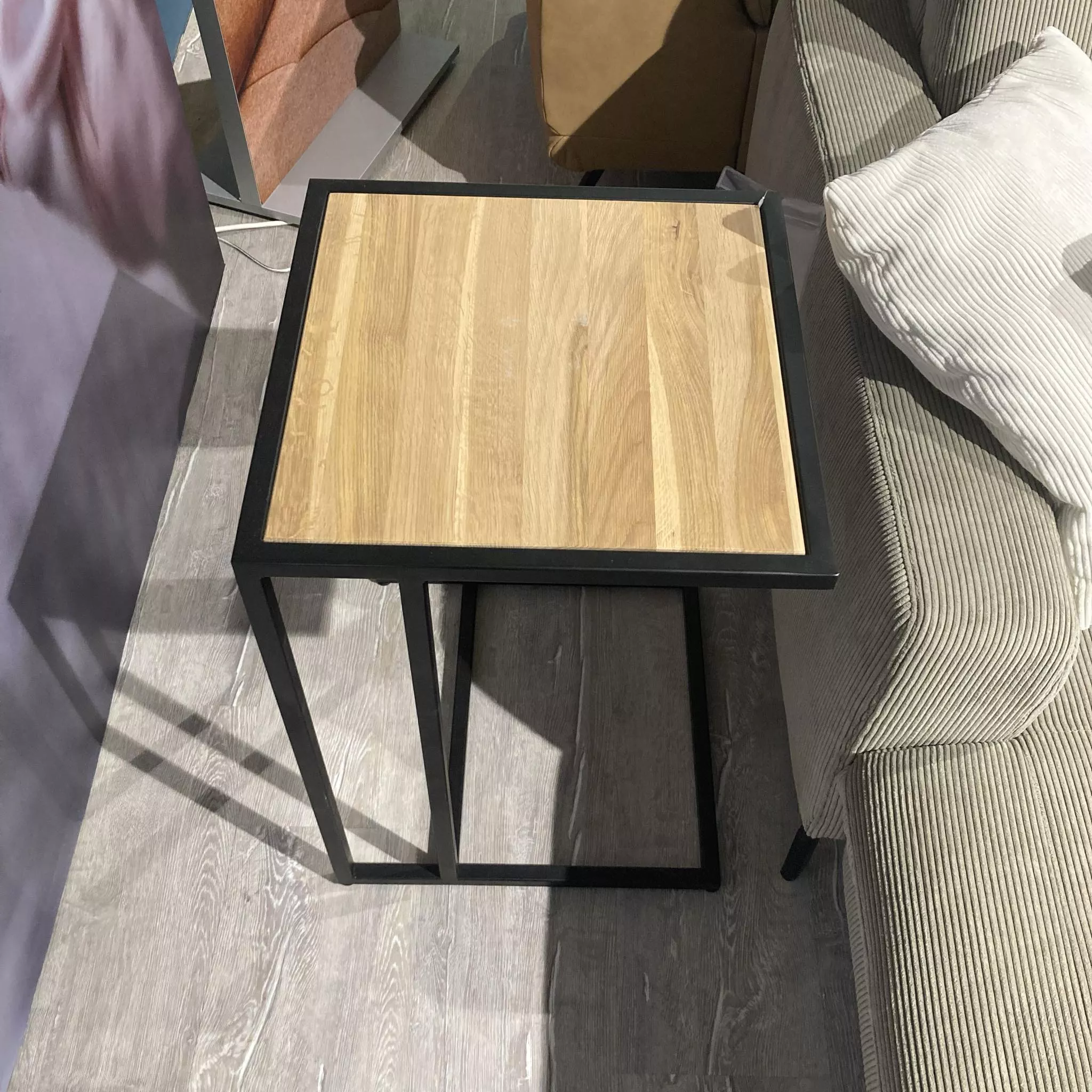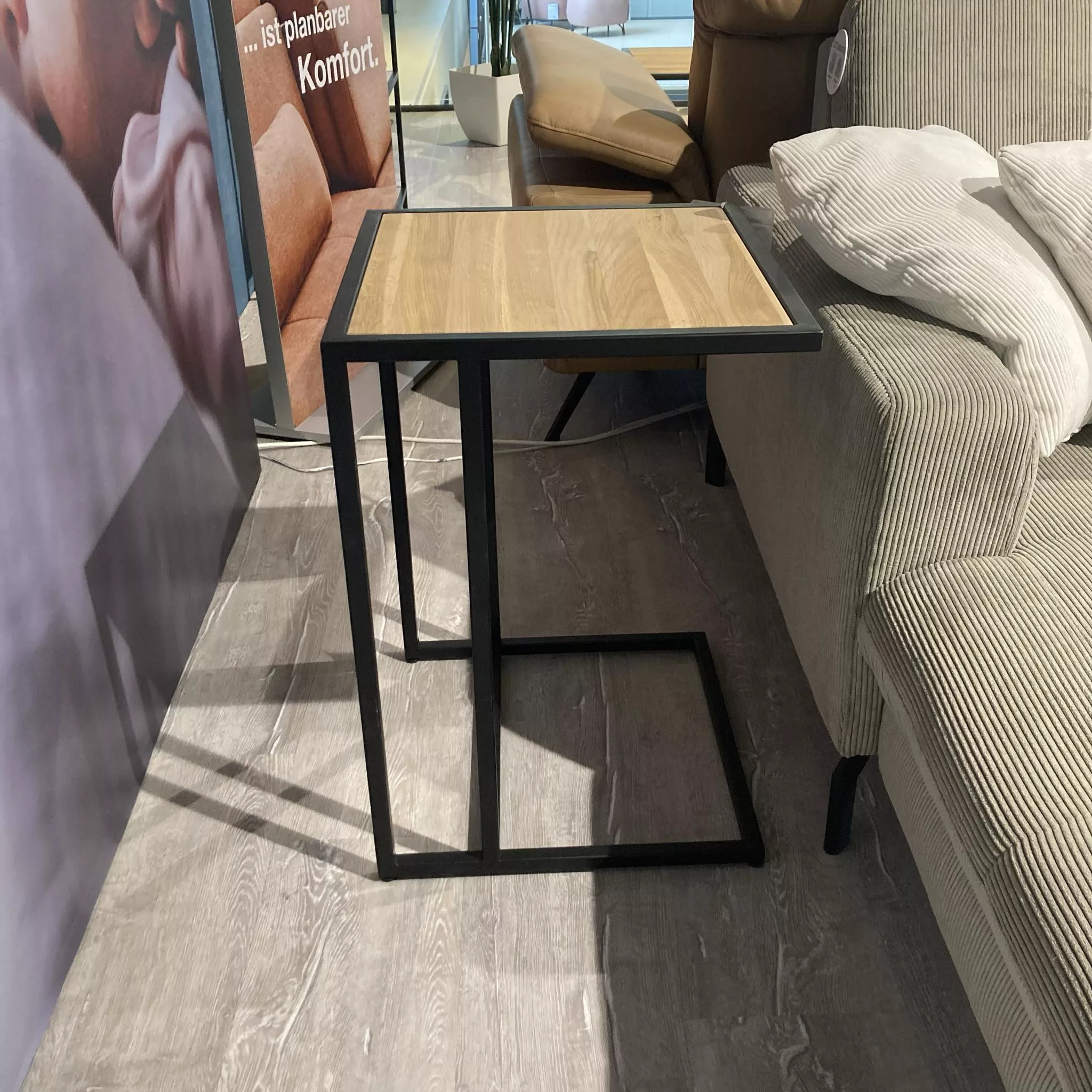Schöner Beistelltisch mit einer Platte aus Eiche und einem Metallgestell in Schwarz.
