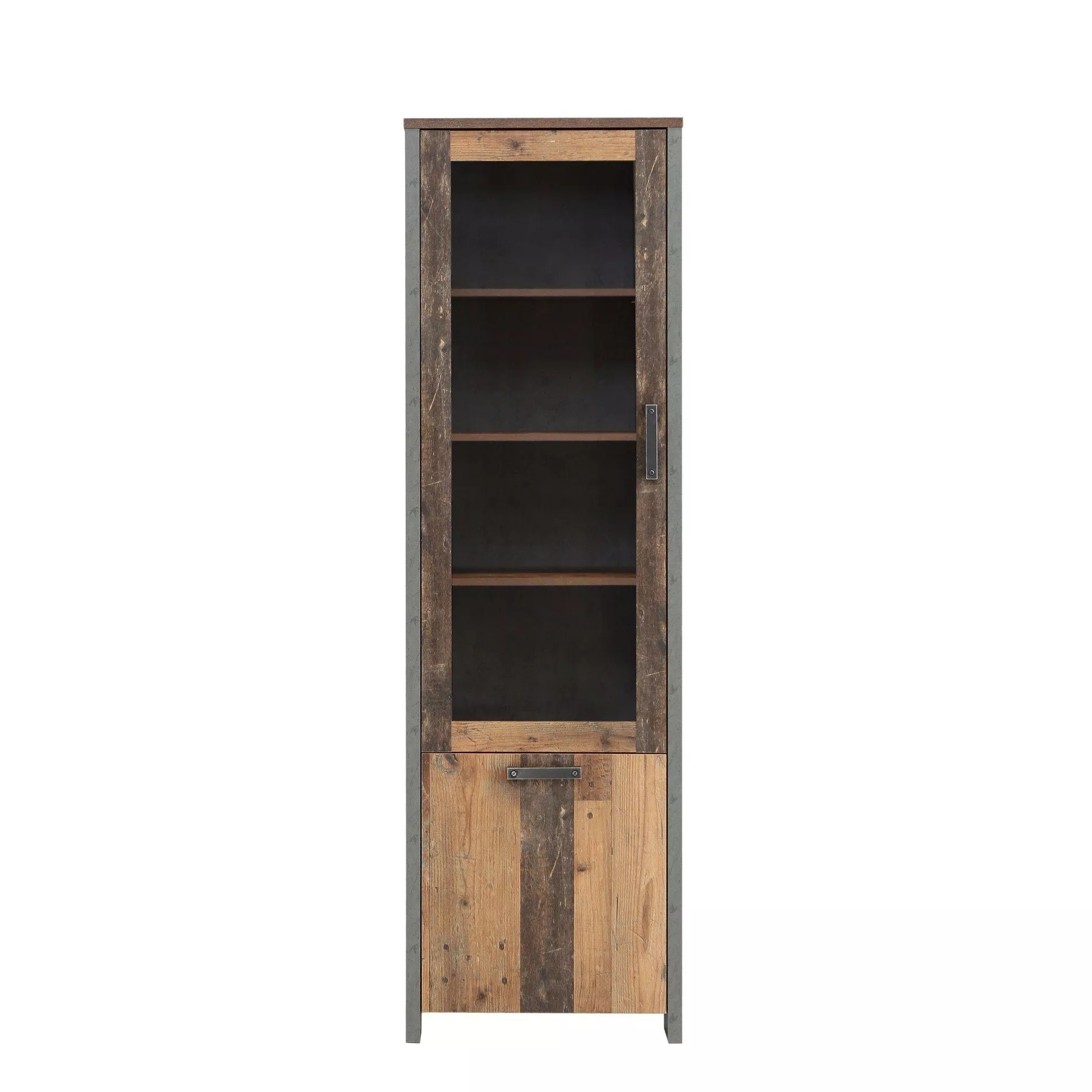Die moderne Vitrine Fea aus dem Hause Trendstore ist eine praktische und elegante Bereicherung für jedes Zuhause. Dieses Möbel bietet viel Stauraum hinter einer Glastür und einer Holztür. Sie passt außerdem optisch zum Industrial-Look und peppt durch die ansprechende Holzoptik in Old Wood Vintage mit Absetzungen in Beton jeden Wohnbereich auf. Dank seiner praktischen Größe eignet sich Fea zudem auch für kleinere Räume.