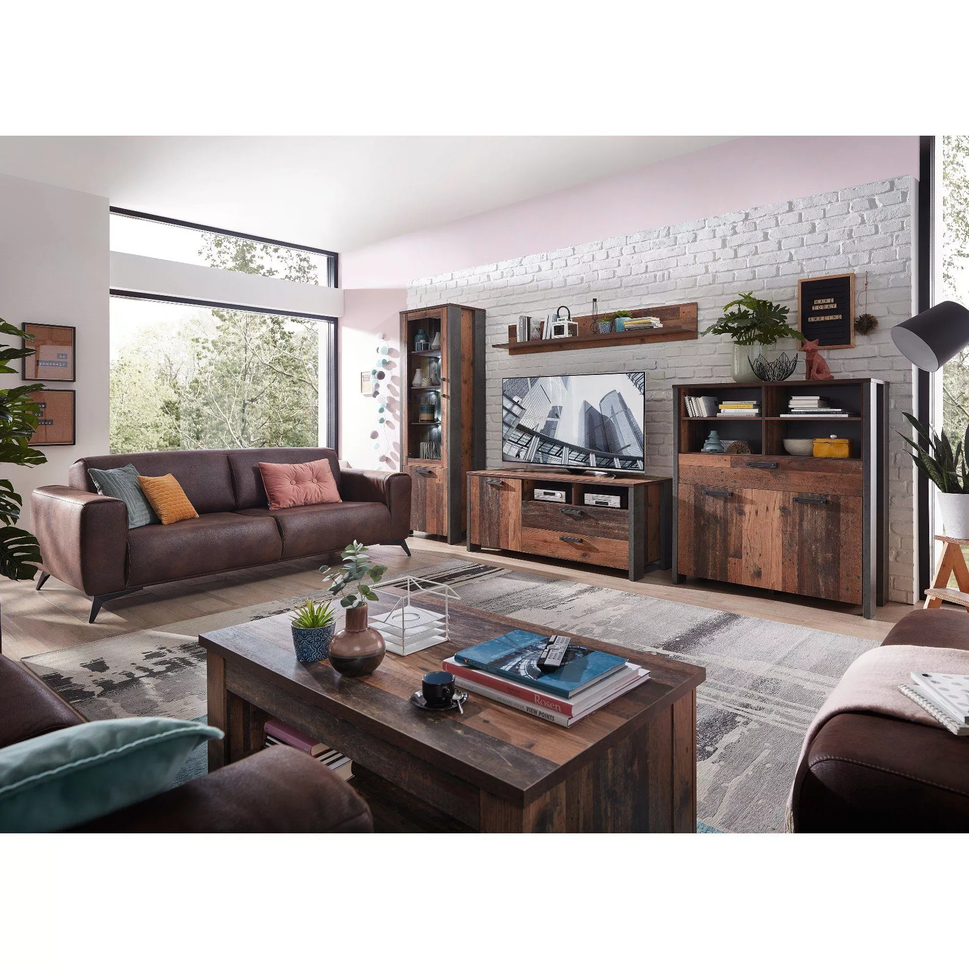 Fea besticht außerdem mit einer beeindruckenden Optik. Ganz im Industrie-Design gehalten, passt die Vitrine besonders gut in modern eingerichtete Räume. Sie besteht aus einem Holzwerkstoff und wurde hochwertig verarbeitet. Die pflegeleichten Kunststoffoberflächen kommen in einer schicken Holznachbildung in Old Wood Vintage daher. Die abwechslungsreichen Farbnuancen strahlen Wärme aus und sorgen für Gemütlichkeit. Die Griffe aus dunklem Metall und die Absetzungen in Beton-Optik an den Seiten sind ein weiterer Hingucker und machen den stylischen Look perfekt.