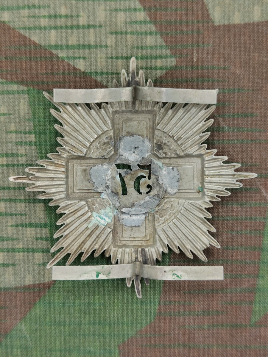Das Emblem zeigt einen Schild in der Form eines 8-zackigen Sterns mit Kreuz und Eichenkranz und Nummerring.